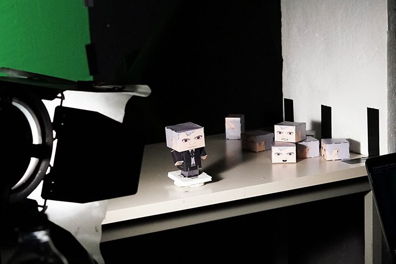 Après l’impression et l’assemblage des papertoys, et après installation du studio, trois jours de shooting démarrent. La bande sonore est terminée, les discours sont bien clairs et concis.
